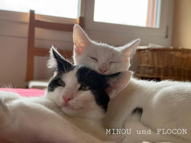 Der liebevolle Flocon (m) ist sehr sozial und schaut gut zu seiner Schwester. Er spielt, jagt und klettert sehr gerne. Wenn er vertraut, braucht er regelmässige Kuscheleinheiten und schnurrt wie ein Weltmeister.