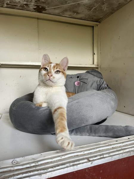 Gordon (rot-weißer Kater) wurde zusammengebrochen am Rand einer stark befahrenen Straße gefunden – zu schwach, um sich zu bewegen, zu erschöpft, um Angst zu haben. Er litt an Katzenschnupfen, war extrem dünn, ausgehungert und hatte starke Schmerzen. Zwei Knochen steckten im Gaumen seines Mundes – ein stilles Leiden, das niemand bemerkt hatte.