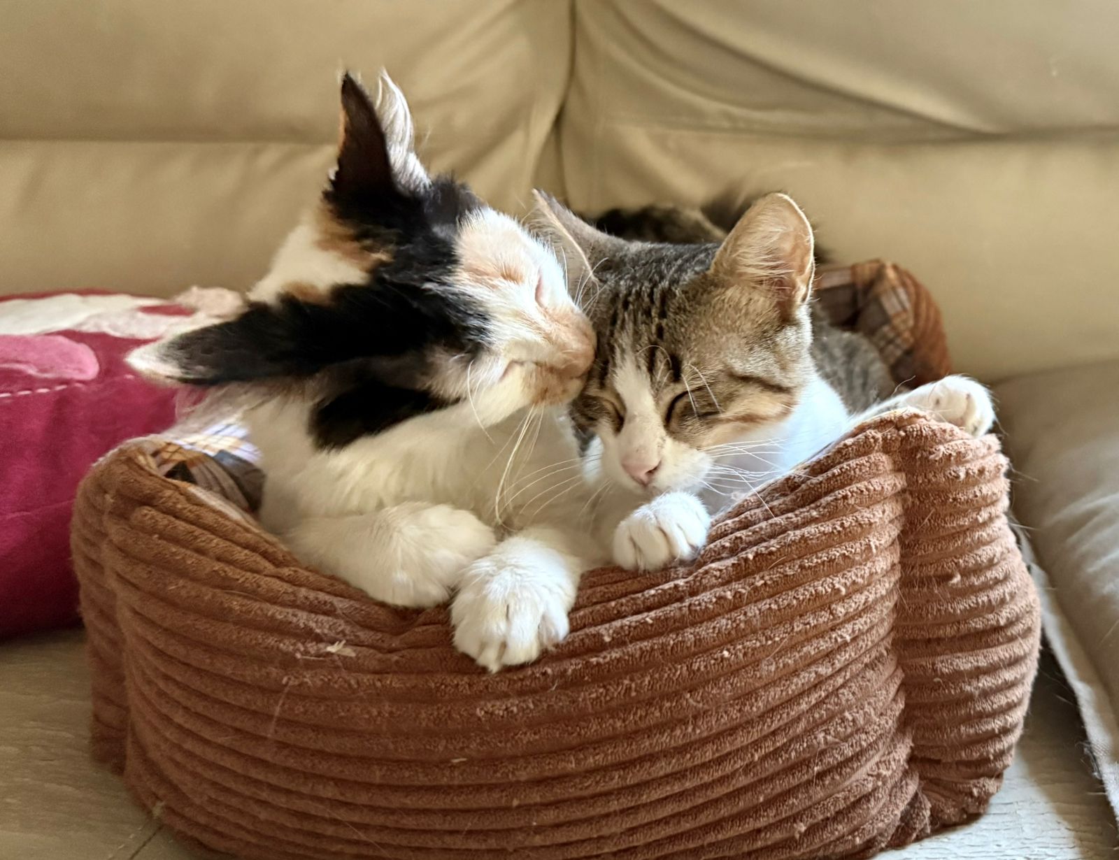 Heute sind sie in Sicherheit auf ihrer Pflegestelle, wo sie nie allein sind. Immer eng aneinander gekuschelt genießen sie nun endlich das, was jedes Kätzchen verdient: gutes Futter, weiche Kissen, viele Spielsachen und ganz viel Liebe und Fürsorge von den Helfern. Sie lieben ihre Leckerlis, spielen stundenlang miteinander und wenn sie müde werden, kuscheln sie sich vertrauensvoll zu ihrem Menschen.
