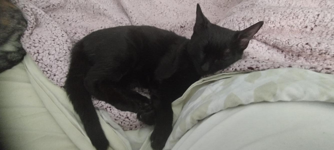 Der hübsche Lolo mit dem nachtschwarzen, glänzenden Fell ist blind. Er wurde auf der Landstrasse im Hinterland von Malaga von einer Touristin als handgrosses Fellbündel mit verklebten Augen aufgefunden. Die lokale Tierschutzorganisation, bei der er abgeben wurde brachte ihn zum Tierarzt. Nach eingehender Untersuchung musste leider festgestellt werden, dass der Sehnerv bei beiden Augen zerstört war.