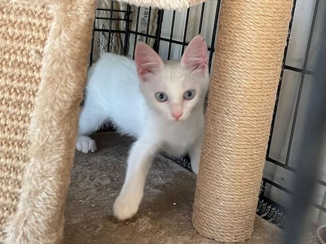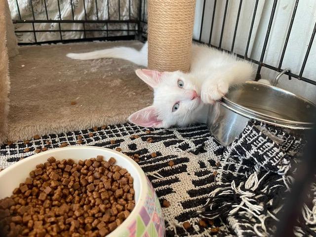 Das schneeweisse Katzenkind Mafalda wurde mit 3 Wochen bei der Polizei abgegeben und in die Auffangstation gebracht.