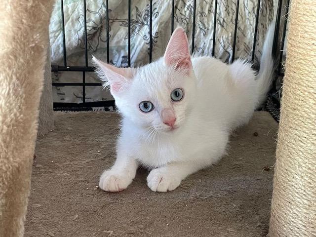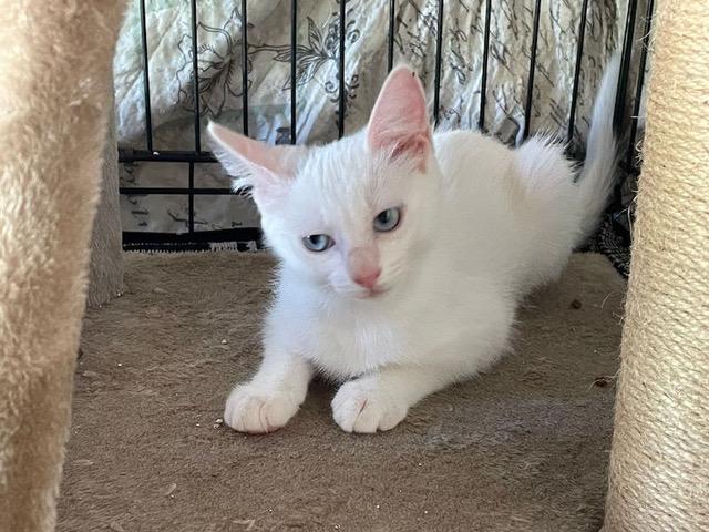 Das schneeweisse Katzenkind Mafalda wurde mit 3 Wochen bei der Polizei abgegeben und in die Auffangstation gebracht.