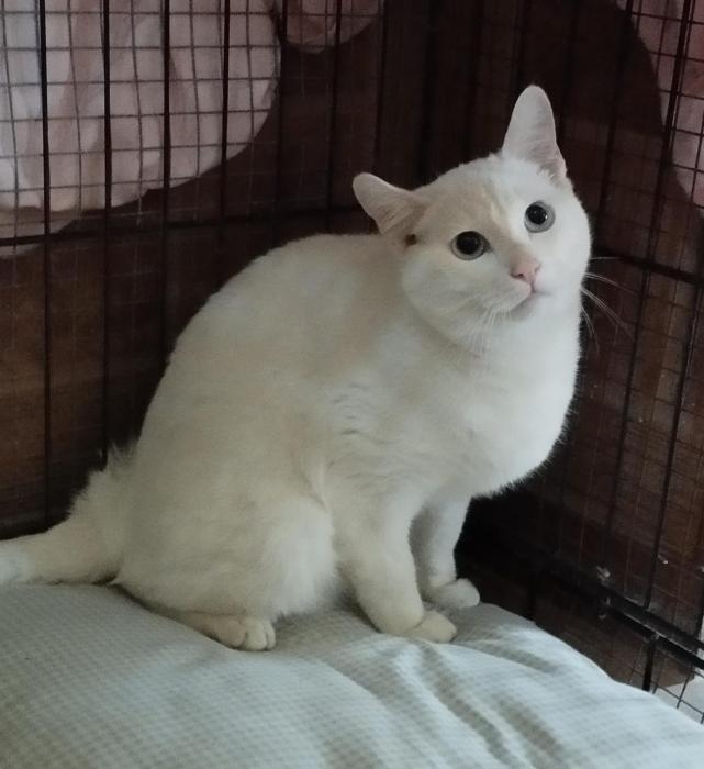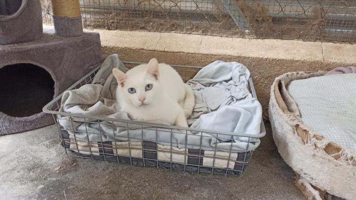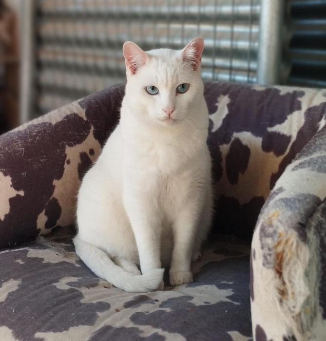 Dieser schneeweisse Kater wurde in Redovan gefunden. Er lebte als Strassenkatze und war bei seiner Ankunft vollkommen verängstigt. Nähe machte ihm Angst, Berührungen liess er zunächst nicht zu. Es brauchte Zeit, Geduld und ruhige Zuwendung, bis er verstanden hat, dass ihm nun nichts mehr passiert.