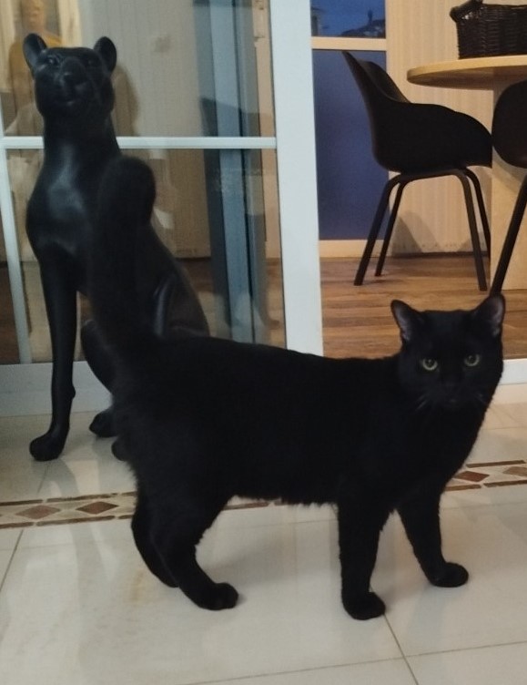 Im März 2025 brachte ein junger Mann fünf schwarze Kitten zu Rita in die Pflegestelle. Er hatte sie in einem Gebüsch gefunden. Sie waren dehydriert und wohl schon mehrere Tage ohne Nahrung. Eines der Kitten konnte nicht mehr gerettet werden. Die anderen vier wurden von Rita aufgepäppelt und haben sich zu tollen, eigenständigen Persönlichkeiten entwickelt. Ihre Schwester Mirija sucht ebenfalls ein schönes Zuhause, der Bruder Max durfte schon in sein Für-Immer-Zuhause umziehen.