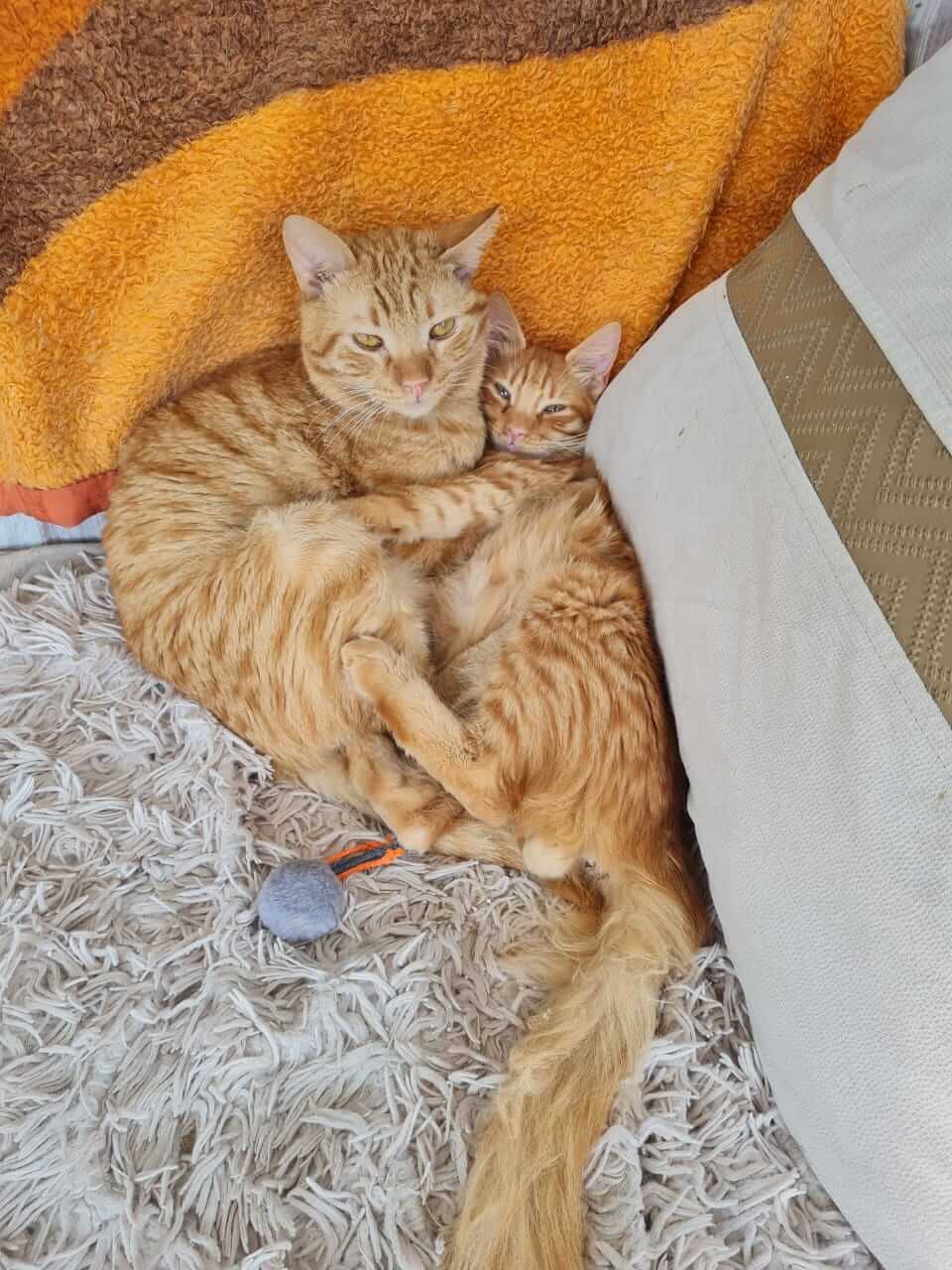 Mikes fand Elisavet als Baby, er war so vollkommen verängstigt und es ging ihm sehr schlecht und sein Überleben war ein kleines Wunder. Mittlerweile ist er der vergnügteste Teenager den man sich nur vorstellen kann und mit einem Bilderbuch Sozialverhalten. Menschen und Katzen gegenüber. Besonders dem roten Mario gegenüber, den liebt er ganz besonders. Und die Zwei sind gleichalt, wir möchten sie nicht voneinander trennen.