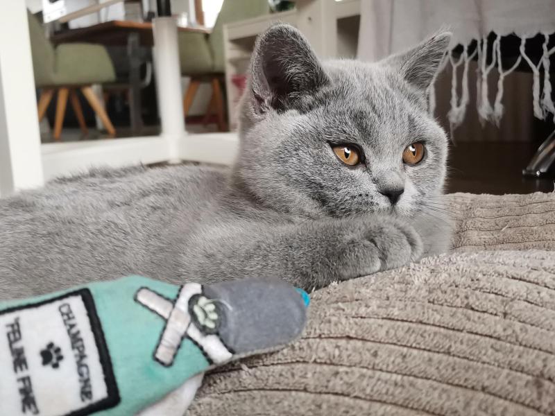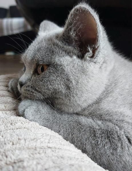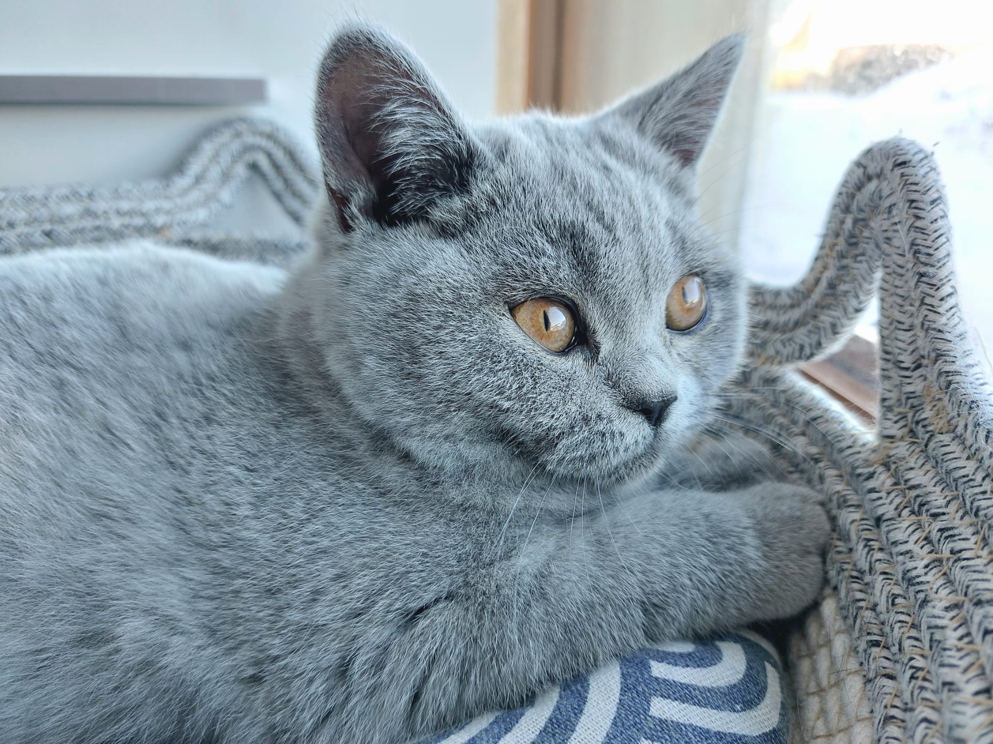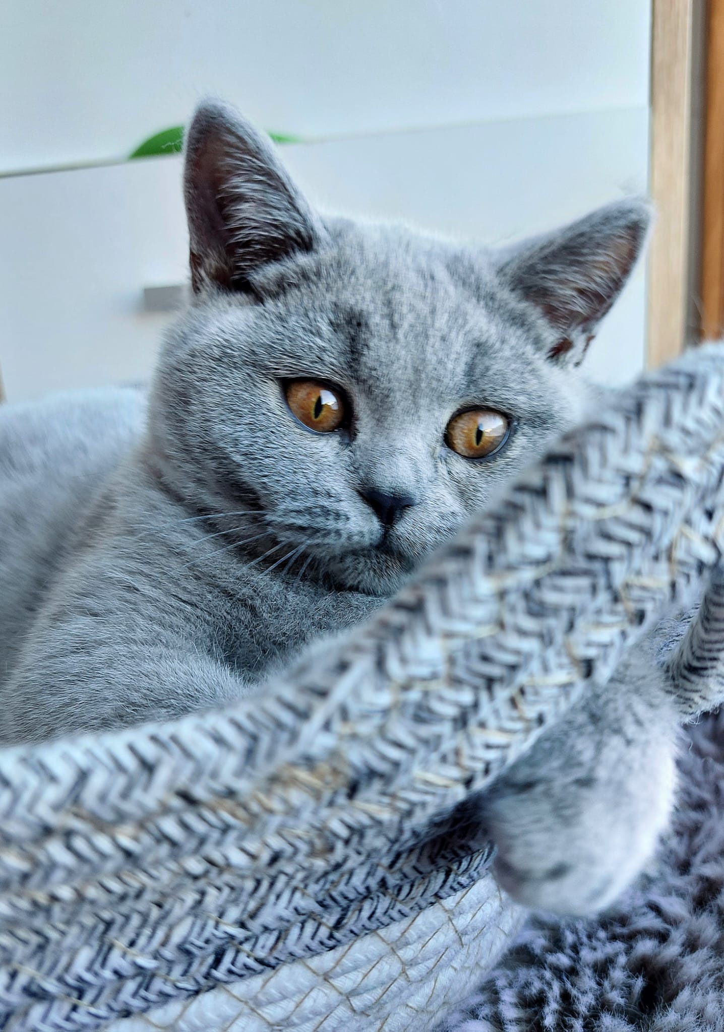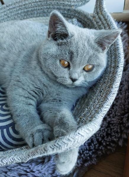 Die Mama Polly ist ein Britisch Kurzhaar blaues Weibchen (BRI a)