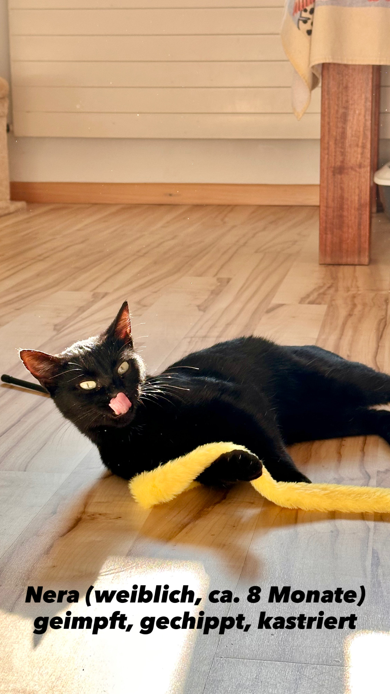 Nera (weiblich, 8 Monate) und Punto (männlich, ca. 10–11 Monate) sind zwei lebensfrohe, verspielte Katzen, die gemeinsam ein schönes Zuhause suchen.