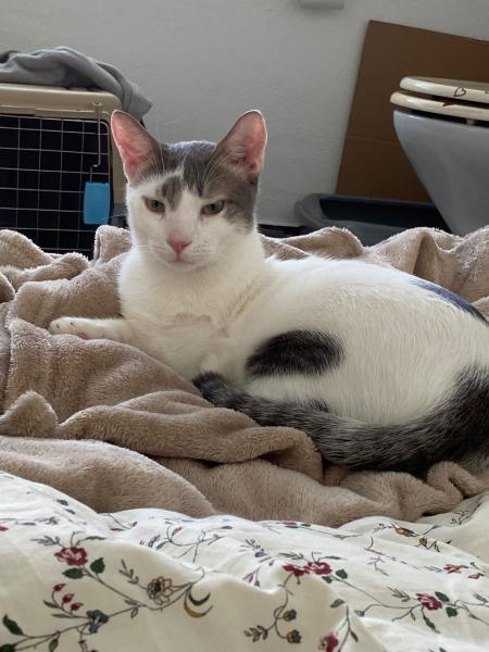 Dumble, weiss/schwarzer Kater, geboren im Juli 2024, hat nur drei Beine, merkt er gar nicht