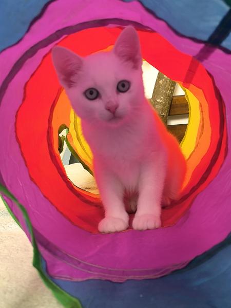 Seine Mutter ist eine BKH und sein Vater ein Ragdoll x Hauskatze. Er hat leuchtend blaue Augen und seidiges Fell.