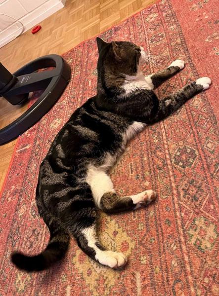 Smokey ist extrem verschmust, kommt sofort und schmiegt sich an die Beine. Er ist recht fordernd für Aufmerksamkeit.