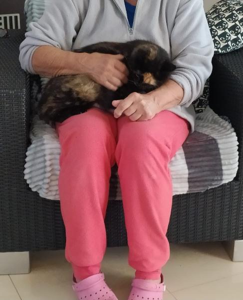 Stella sucht mit ihrer bescheidenen, sanften Art den Zugang zum Menschen. Sie geniesst es mittlerweile auf dem Schoss der Tierschützerin für eine Zeit zu verweilen und gestreichelt zu werden. Mit dem katzenfreundlichen Familienhund kommt sie gut klar.