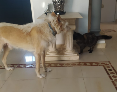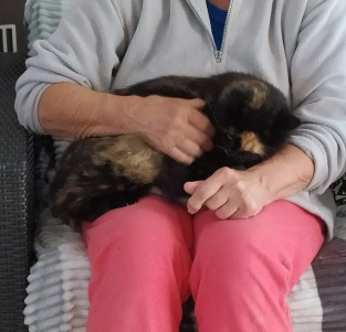 Stella sucht mit ihrer bescheidenen, sanften Art den Zugang zum Menschen. Sie geniesst es mittlerweile auf dem Schoss der Tierschützerin für eine Zeit zu verweilen und gestreichelt zu werden. Mit dem katzenfreundlichen Familienhund kommt sie gut klar.
