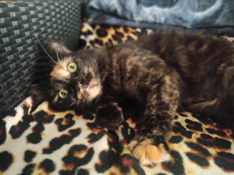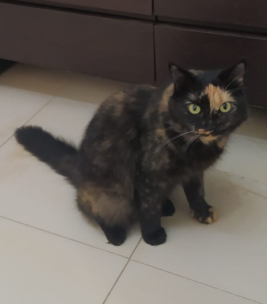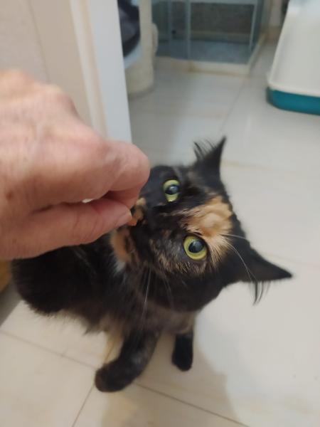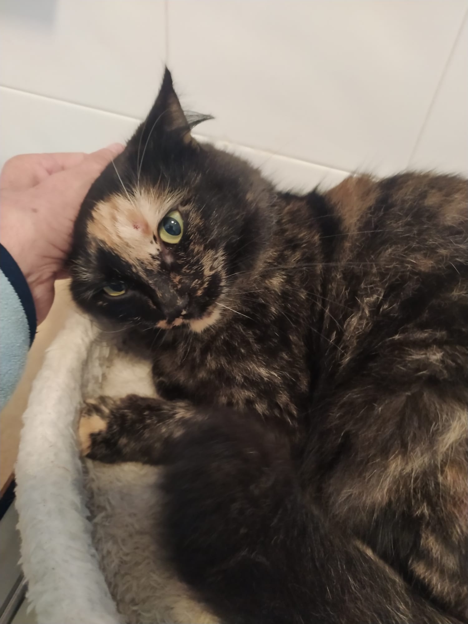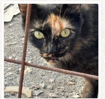 Nimm mich mit, schienen die schönen grünen Augen der schmalen Schildpatt-Katze zu sagen und das tat dann die Tierschützerin auch nach einigen Wochen der Fütterung. Sie konnte sie auf die Arme nehmen und im Auto in die mitgebrachte Transportbox packen.