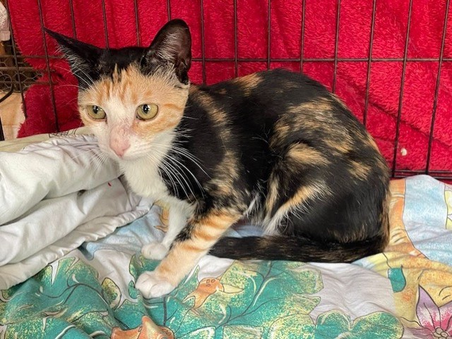 Das hübsche Tricolor Katzenmädchen Trixie wurde völlig eingeschüchtert in einer Katzenkolonie gefunden. Tierschützer nahmen es mit und brachten Trixie in die Auffangstation.