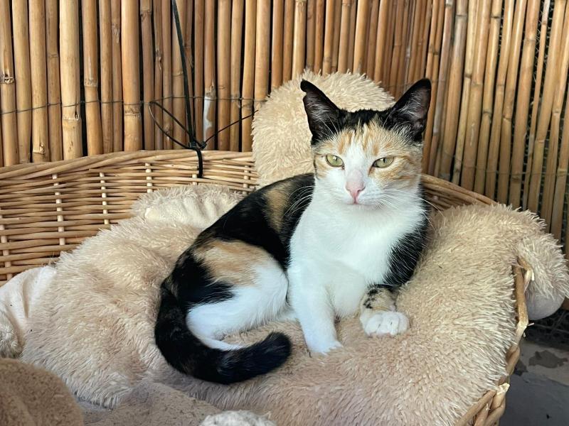 Kleine tricolore Katze Trixie wartet auf ihr Happy End