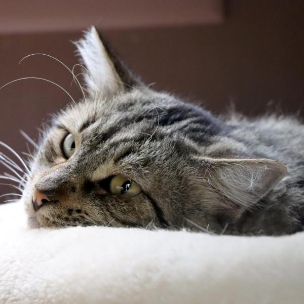 Da sein Fell recht lang ist, braucht er etwas Pflege – wer ihn adoptiert, sollte also bereit sein, ihn regelmässig zu bürsten ✨🐈⬛.